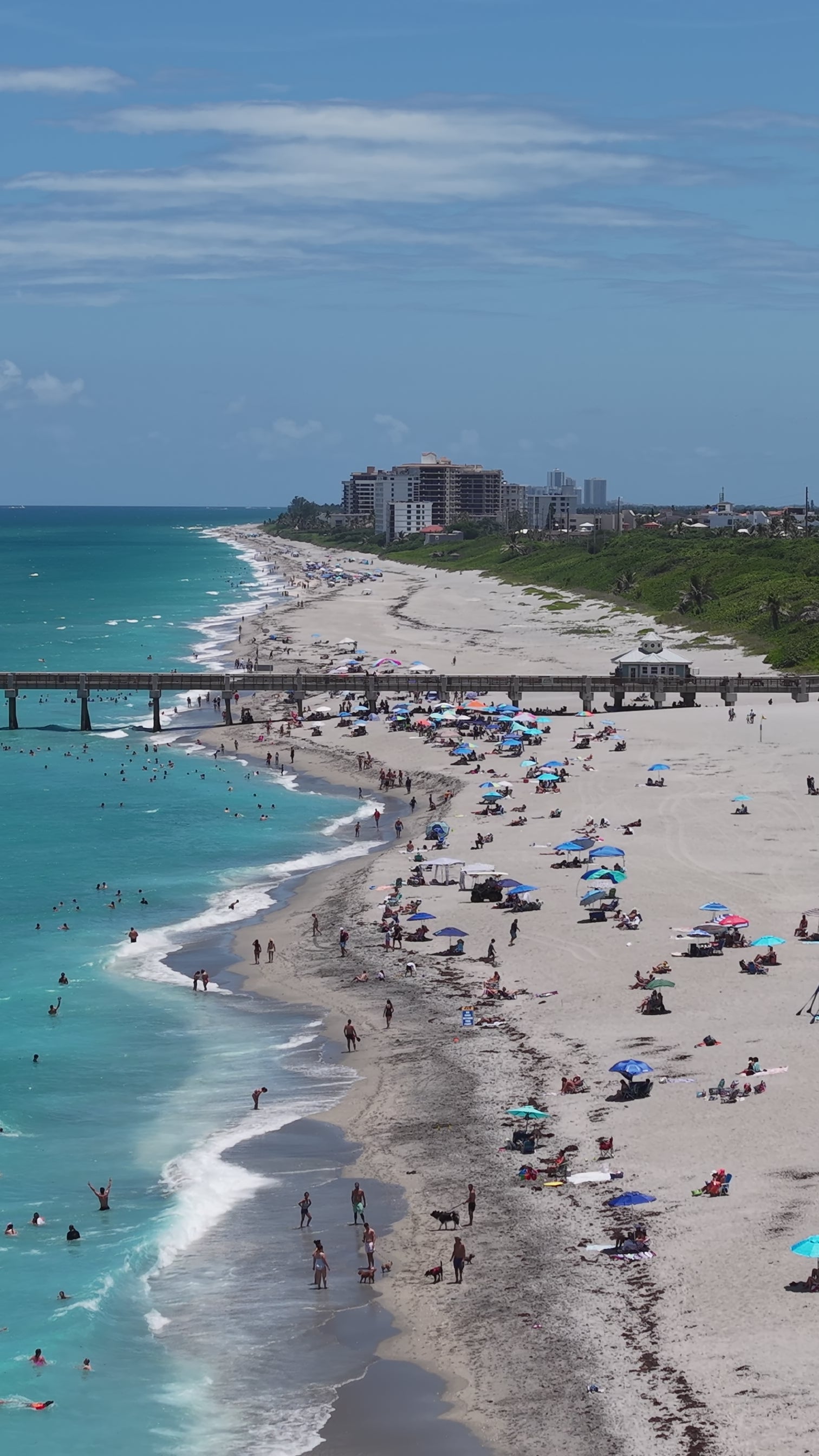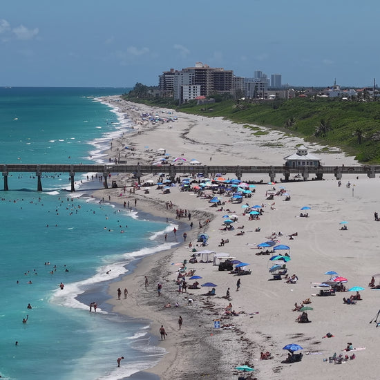Capture the vibrant energy of a bustling day at Juno Beach Pier, set against the backdrop of crystal-clear blue waters. This scene showcases the harmonious blend of lively activity and serene natural beauty, perfect for those seeking a sophisticated coastal experience.